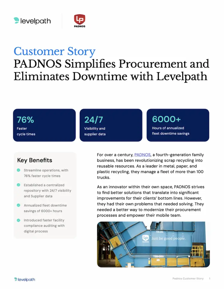 PADNOS, a leader in metal, paper, and plastic recycling, was using legacy systems to manage procurement processes, which resulted in lost time and poor user experience. After discovering Levelpath, they were able to implement guided buying and establish stronger workflows that simplified procurement, increased efficiency, and empowered their teams across 30 locations.
