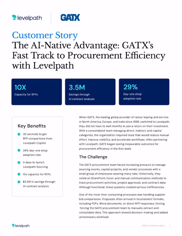 GATX’s early results with Levelpath highlight how quickly the platform delivers real impact, from dramatically shortening RFP evaluation times to launching sourcing initiatives in just days. As procurement expands workflows, scales automation, and taps into deeper AI-driven insights, GATX is not just optimizing procurement, it is transforming it. The business is building a smarter, more agile procurement function, setting a new benchmark for procurement efficiency in a rapidly evolving and competitive landscape.