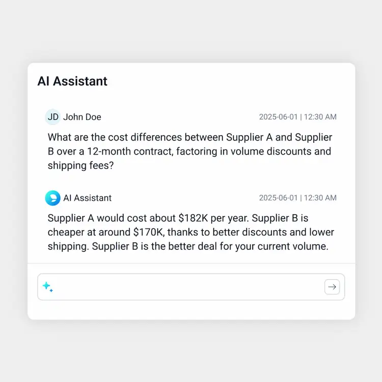 Use AI Agents to answer questions, generate comparison tables, and conduct what-if calculations for faster, smarter sourcing decisions.