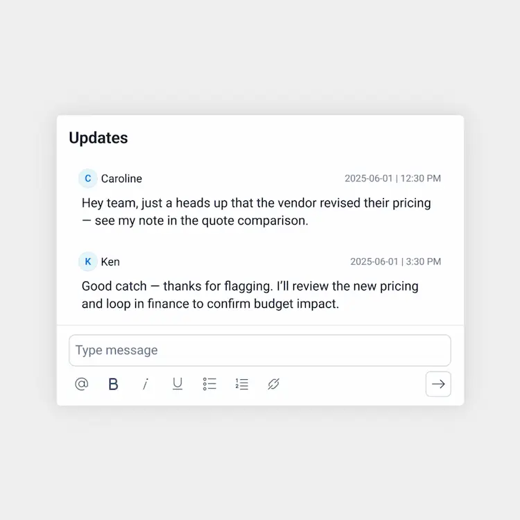 Levelpath provides comments, alerts, and 1:1 messaging to keep teams and suppliers connected.