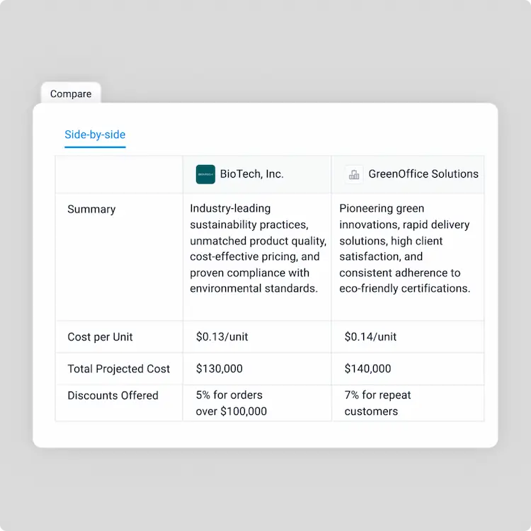 Organize unstructured proposals into side-by-side comparisons, using AI-driven insights to highlight key differences and ensure a fair, strategic selection process.
