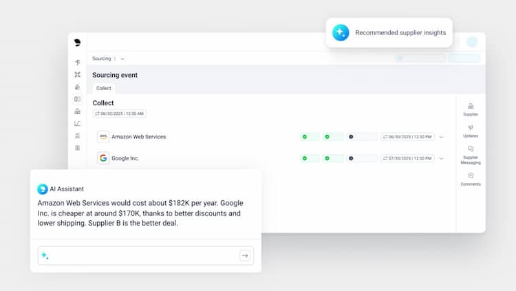Create events in minutes and leverage AI Agents to organize, analyze, and summarize supplier responses.
