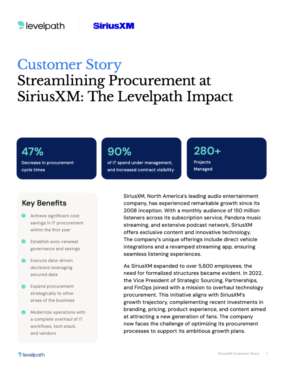 As SiriusXM expanded to over 5,600 employees, the need for formalized structures became evident. In 2022, the Vice President of Strategic Sourcing, Partnerships, and FinOps joined with a mission to overhaul technology procurement. This initiative aligns with SiriusXM’s growth trajectory, complementing recent investments in branding, pricing, product experience, and content aimed at attracting a new generation of fans. The company now faces the challenge of optimizing its procurement processes to support its ambitious growth plans.